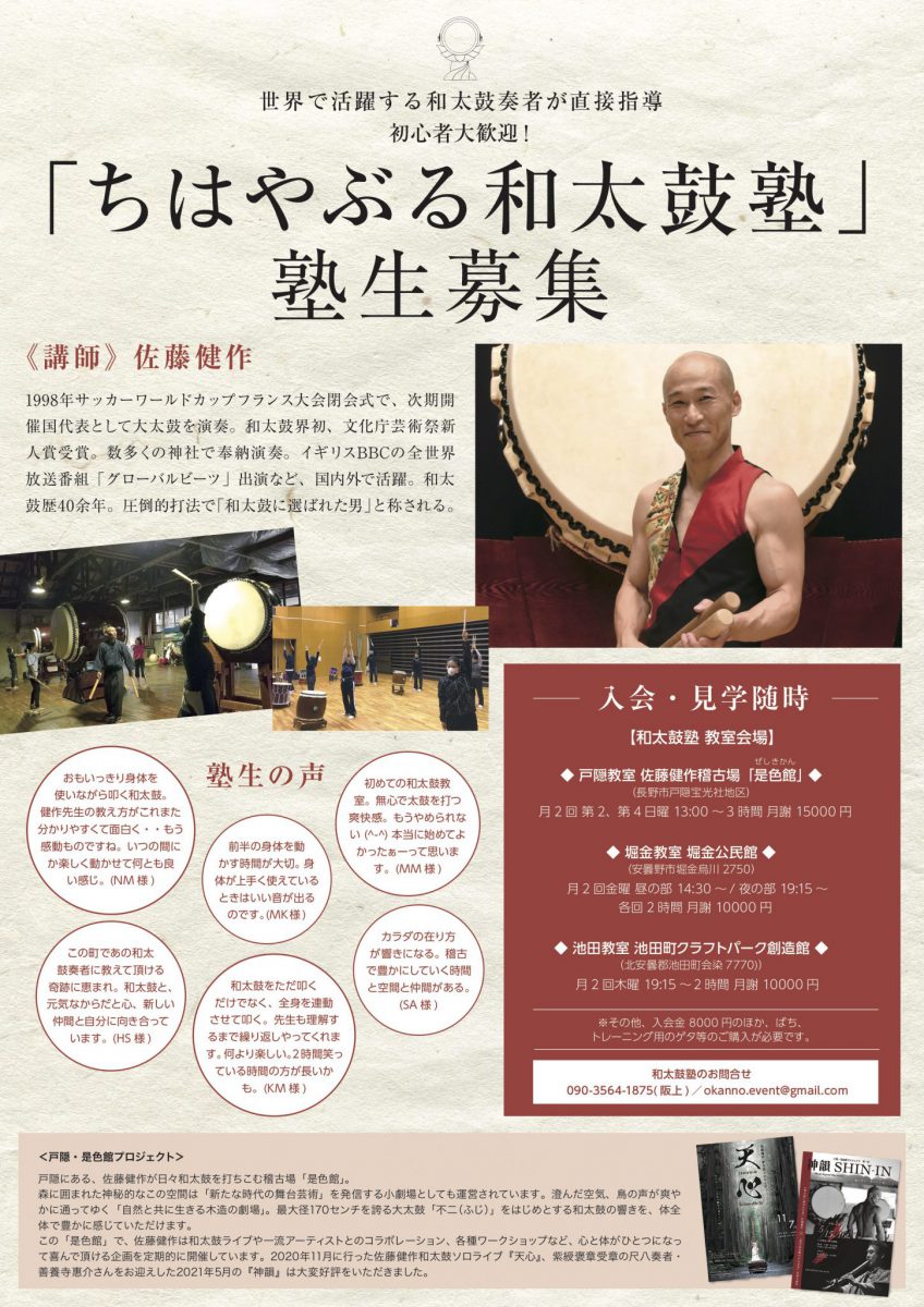 日々、信州の霊地・戸隠にて個人所有世界最大級の大太鼓「不二」を打ち込む。